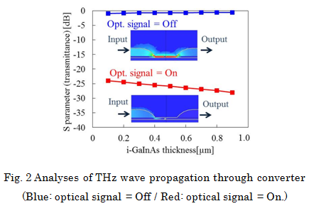| Figure 1 shows the conceptual diagram of the optical-THz signal converter on semi-insulating InP substrate. The THz wave propagates through the microstrip waveguide consisting of n+-GaInAs (~1×1019 cm-3)/i-GaInAsP/benzocyclobutene (BCB)/Ti/Au layer. The n+-GaInAs layer acts as a bottom metal ground since the imaginary part of the refractive index is enough large for THz signal. At the middle of this THz waveguide, the THz wave propagates into a converter section consisting of n+-GaInAs (~1×1019 cm-3)/i-GaInAs/p+-GaInAs (~1×1019 cm-3)/Ti/Au layer. The size of this converter is much smaller than the spot size of THz wave and the propagation through such a small converter can be achieved by utilizing plasmonic effect. When 1.55 μm optical signals are input into the GaInAs layer from an integrated optical waveguide at the side of the converter section, free carriers are generated due to the photon absorption as the bandgap energy of the GaInAs is smaller than the photon energy. In this case, the converter section acts as metallic wall by free carrier absorption and skin effect, resulting in decreasing the transmittance of THz waves. On the other hand, THz waves can transmit when the optical signals are switched off. Therefore, the THz waves can be modulated by the optical signals injected into the GaInAs converter section. |
