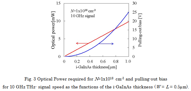 Figure 3 shows the required optical power for a carrier density of N = 1×1018 cm-3 (the red line) and required pulling-out bias for 10 GHz THz signal (the blue line). With this structure, the optical signal power and the bias voltage can be suppressed to less than 10 mW and 10 V, if the thickness of i-GaInAs is less than 0.6 μm. For thinner i-GaInAs thickness, higher modulation speed can be possible.
