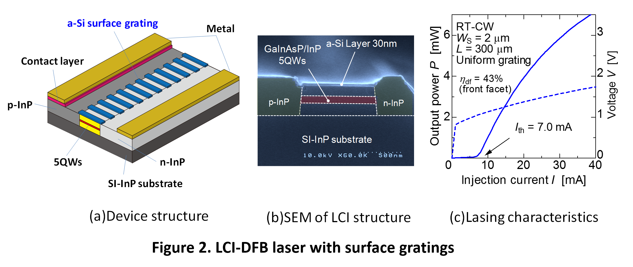 | 半導体薄膜レーザではこれまでに、光励起下において低しきい値動作が実証されていますが、 外部励起光が不要な電流注入動作の実現が重要な課題となります。 半導体薄膜レーザの電流注入動作に向けて、pn接合をクラッド層の上下ではなく、左右に形成しキャリヤ注入を行う横方向電流注入構造(LCI = Lateral Current Injection)を導入しております。このLCI構造での動作を確認するために、半絶縁性基板上LCI構造を作製し、電流注入動作を達成しています。この構造は下部クラッド層が半導体材料であるために強光閉じ込め効果は得られませんが、 薄膜コア層を有するLCIレーザが実現可能であることを示しています。さらにFigure 2に示すようにLCI構造に表面回折格子を形成したLCI-DFBレーザでは従来型の半導体レーザと比較しても遜色のない良好な発振特性が実現されています。本構造に誘電体クラッド層を導入することで、 さらなる低消費電力動作が期待できる電流注入型半導体薄膜レーザを実現します。