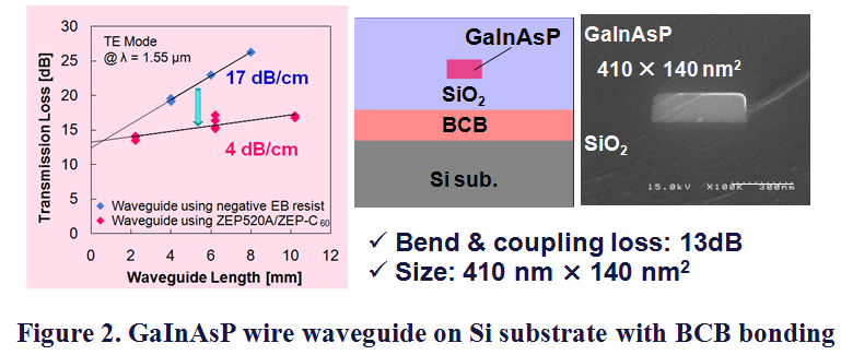 | GaInAsP細線導波路については、伝播損失 4dB/cmの低損失導波路が得られております。今後Si基板上V-X族メンブレン光回路の実現に向けて、より低損失導波路を目指し、レーザとの集積及びGaInAsP導波路デバイスとしての光機能素子への研究が進められております。